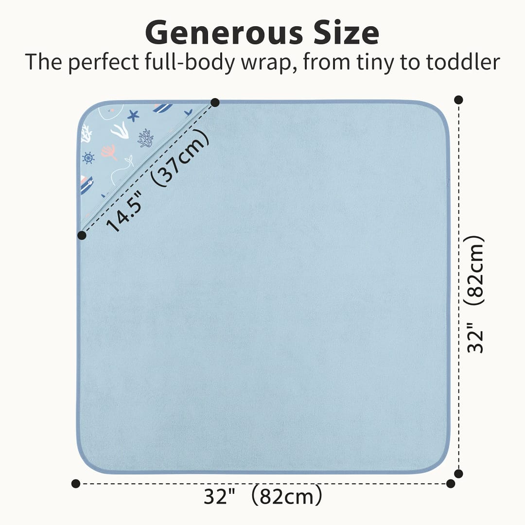 - Generous Size: The thoughtfully designed hood on this baby bath towel adds an adorable touch to your little one. Its 32×32-inch size provide ample coverage to fit comfortably over their head, allowing you to dry your baby with ease while keeping their head warm and snug after baths.