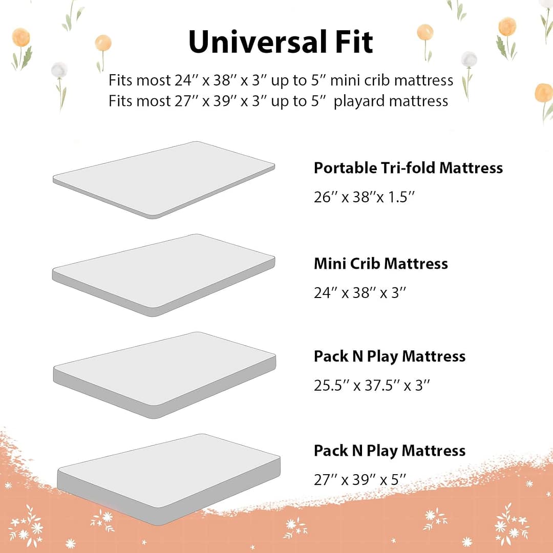 Measuring 38” x 26” and 6” deep pocket, which are suitable for mini crib and pack n play mattresses.