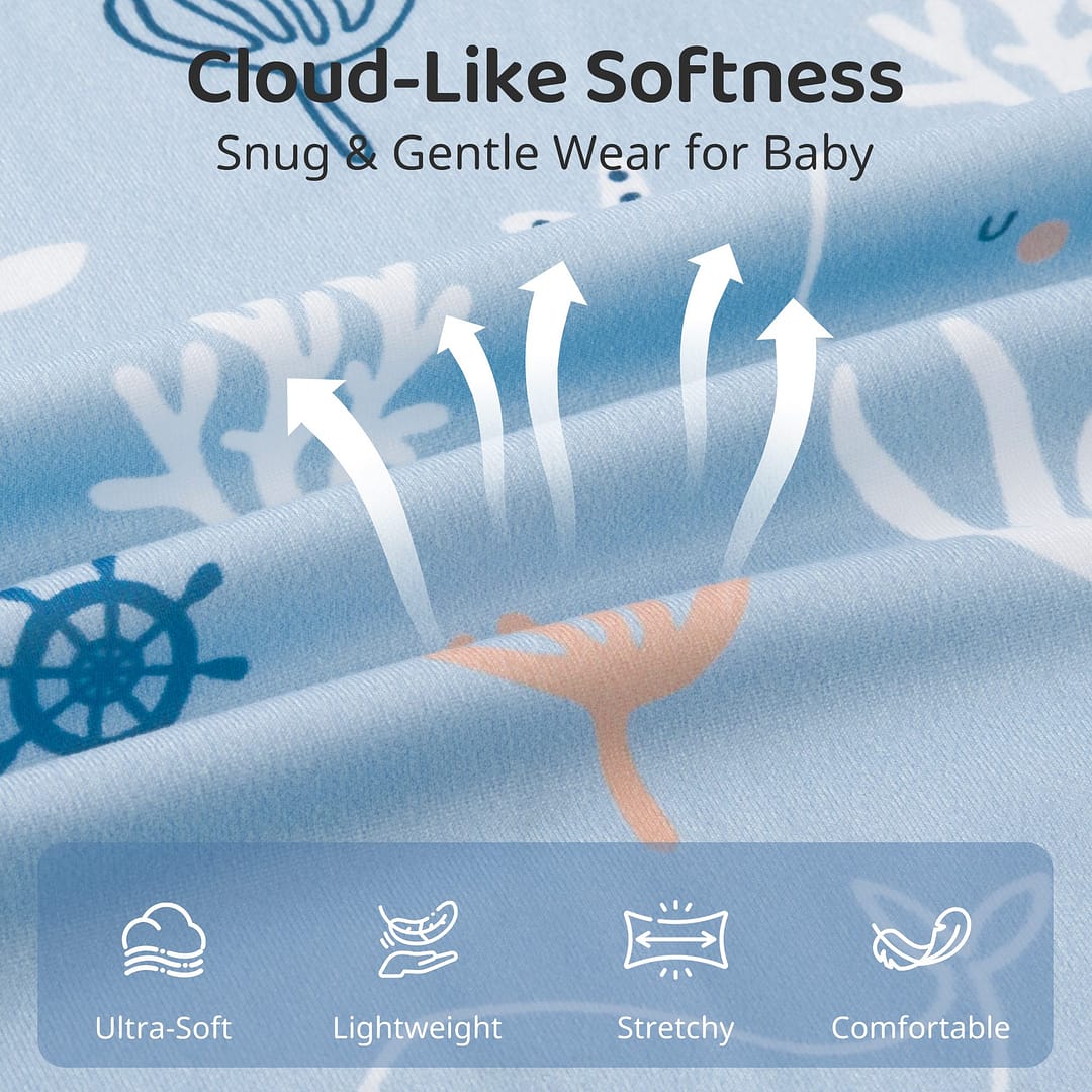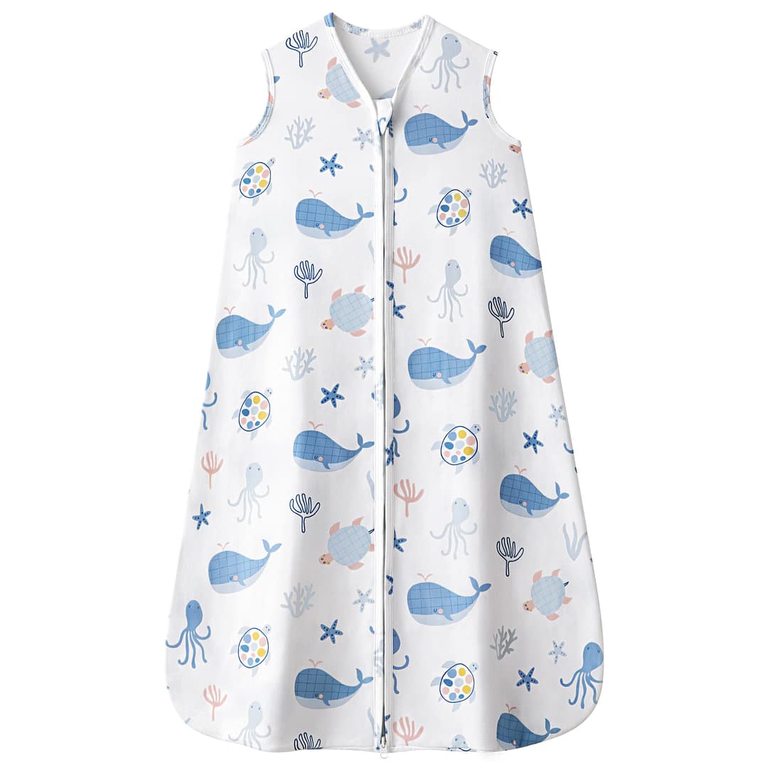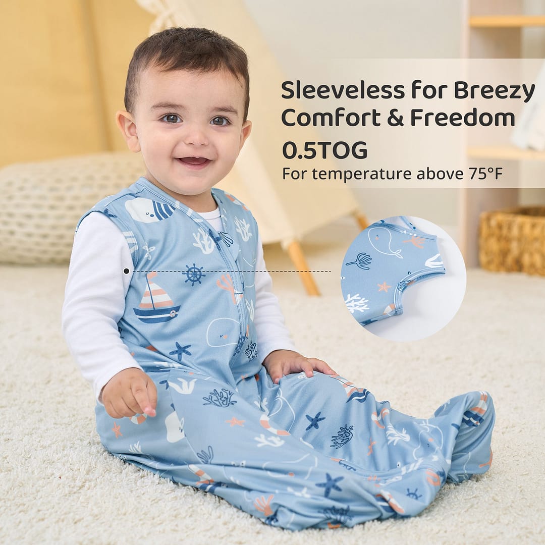 - 【Comfortable Temperature】This thin sleep sack features 0.5 TOG and sleeveless design, offering moderate warmth, ideal for spring, summer or air-conditioned rooms. The lightweight fabric delivers peaceful naps and all-night comfort for baby. With its soft, stretchy design, this baby wearable blanket provides just the right amount of coziness—keeping your baby snug and content.