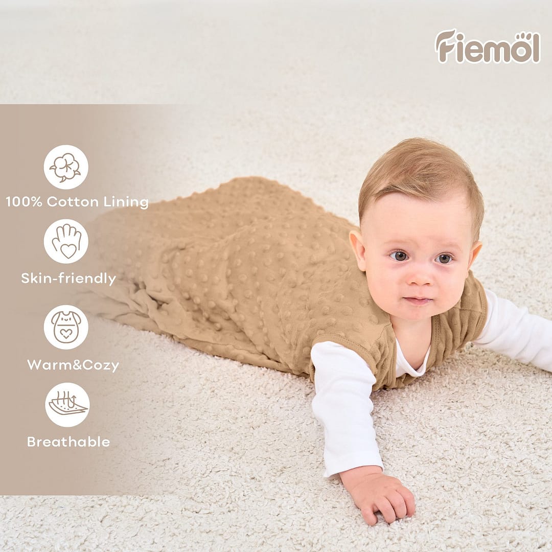 • 2 Layer Fabric: FIEMOL baby sleep sack 6-12 months is designed by 2 layers—— breathable cotton inner layer and ultra-soft plush outer layer. It plays great role in preventing your baby from overheating or sweating, and keeping warm during mildly cold weather. 1.5 tog baby sleeping sack is prioritised at all seasons as it is definitely suitable for autumn and spring and with warm clothes in winter.