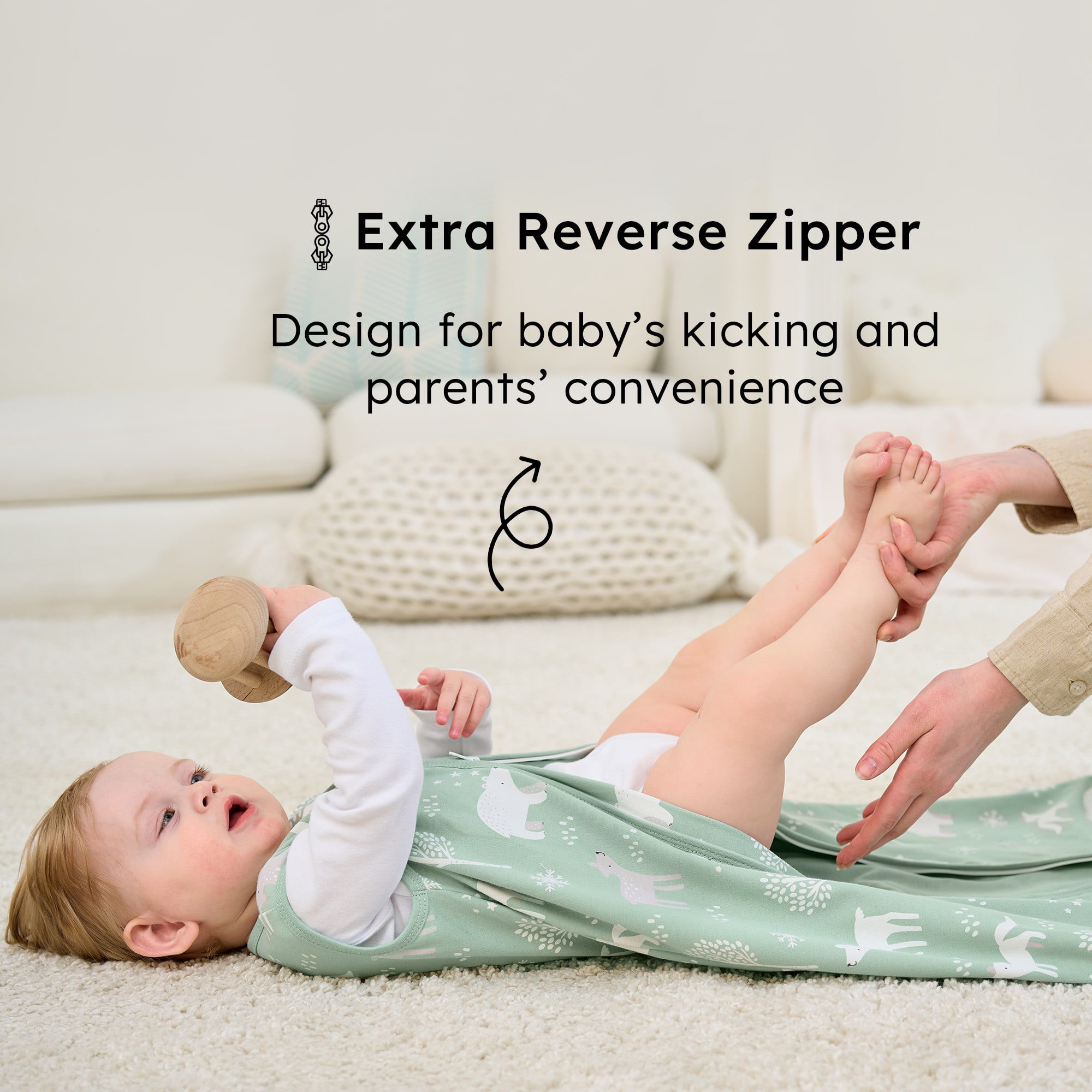 In order to make diaper changes a breeze, we install 2 zippers on this baby sleep sack.