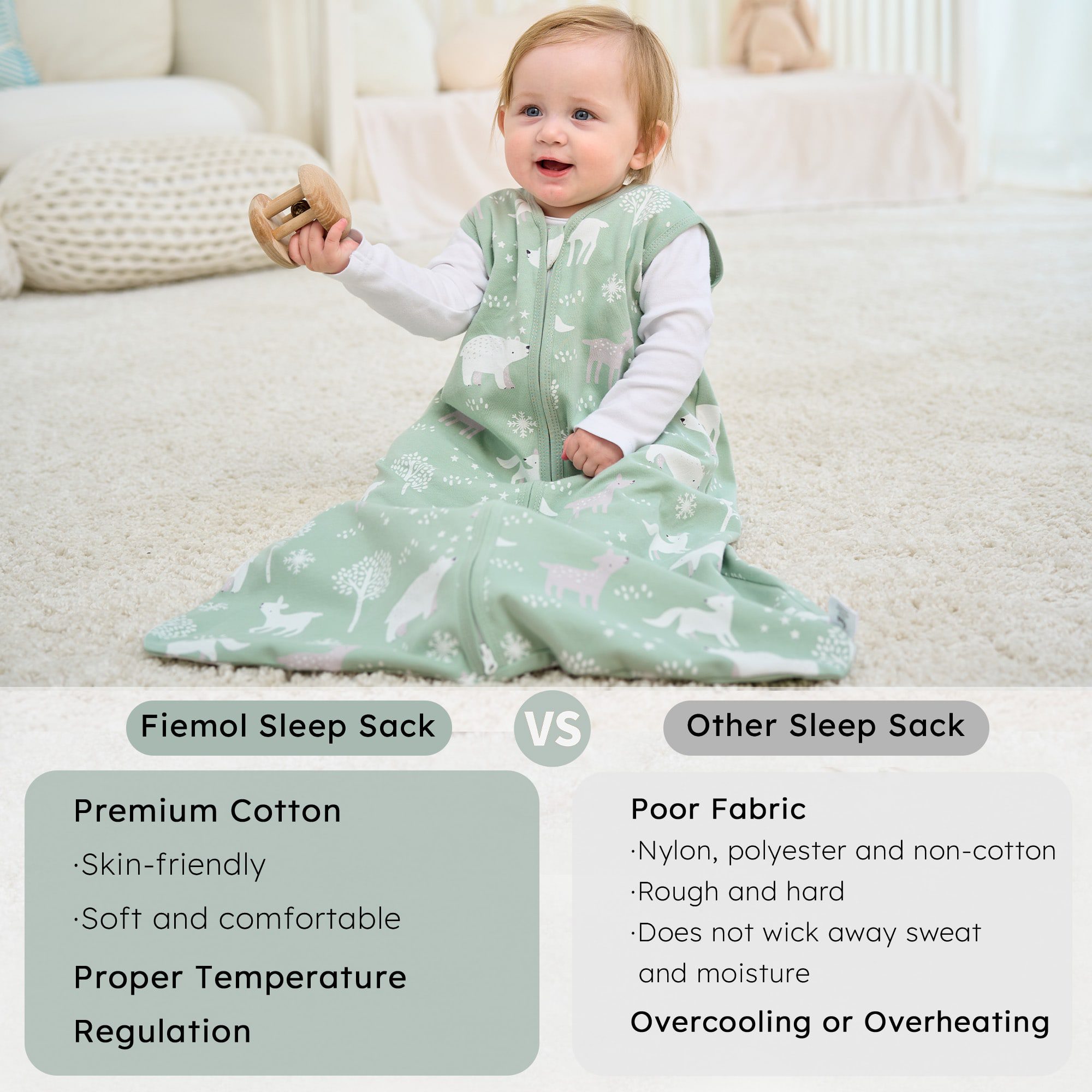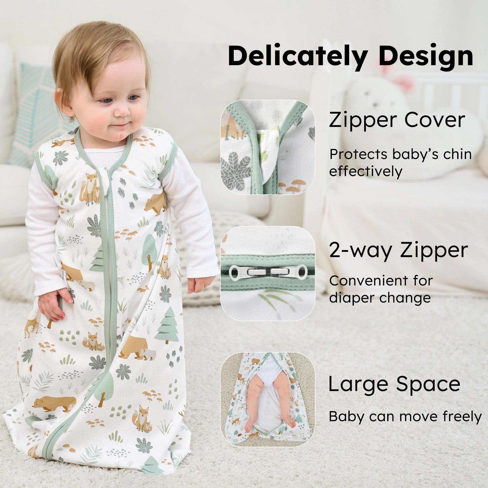 - Sustainable Double Zipper: We apply a two-way zipper on the sleep sack for a more convenient use for changing diapers. Since a good zipper for the sleep sack is as important as a proper lid for the themal mug. We equip the sleep sack with high quality zipper, which is smooth even after tens of thousands of uses.